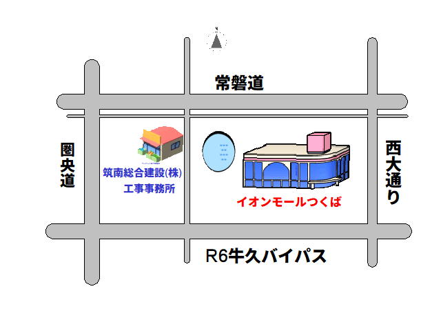 周辺地図 筑南総合建設株式会社 工事事務所 〒300-1233 つくば市梶内577-4 TEL.029-836-5772 アクセス 電車の場合 JR常磐線ひたち野うしく駅西口を出て、西大通りを北へ約10分。 ※ご連絡を頂ければ、送迎いたします。 自動車の場合 圏央道つくば牛久インターチェンジから約500m ※駐車場あり ※つくばイオンモール西側、つくばジャンクション南側。